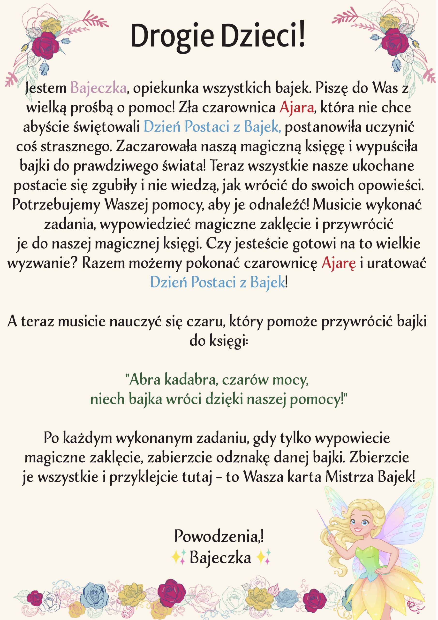 Gdy zła czarownica Ajara zaczarowała magiczną księgę, bohaterowie bajek wydostali się do prawdziwego świata i się pogubili! Dzieci muszą wyruszyć na misję ratunkową, odnajdując i ratując postacie z ulubionych opowieści, by przywrócić je do ich bajek. To świetna okazja, aby nauczyć się współpracy, odwagi i rozwiązywania problemów w bajkowej atmosferze.
