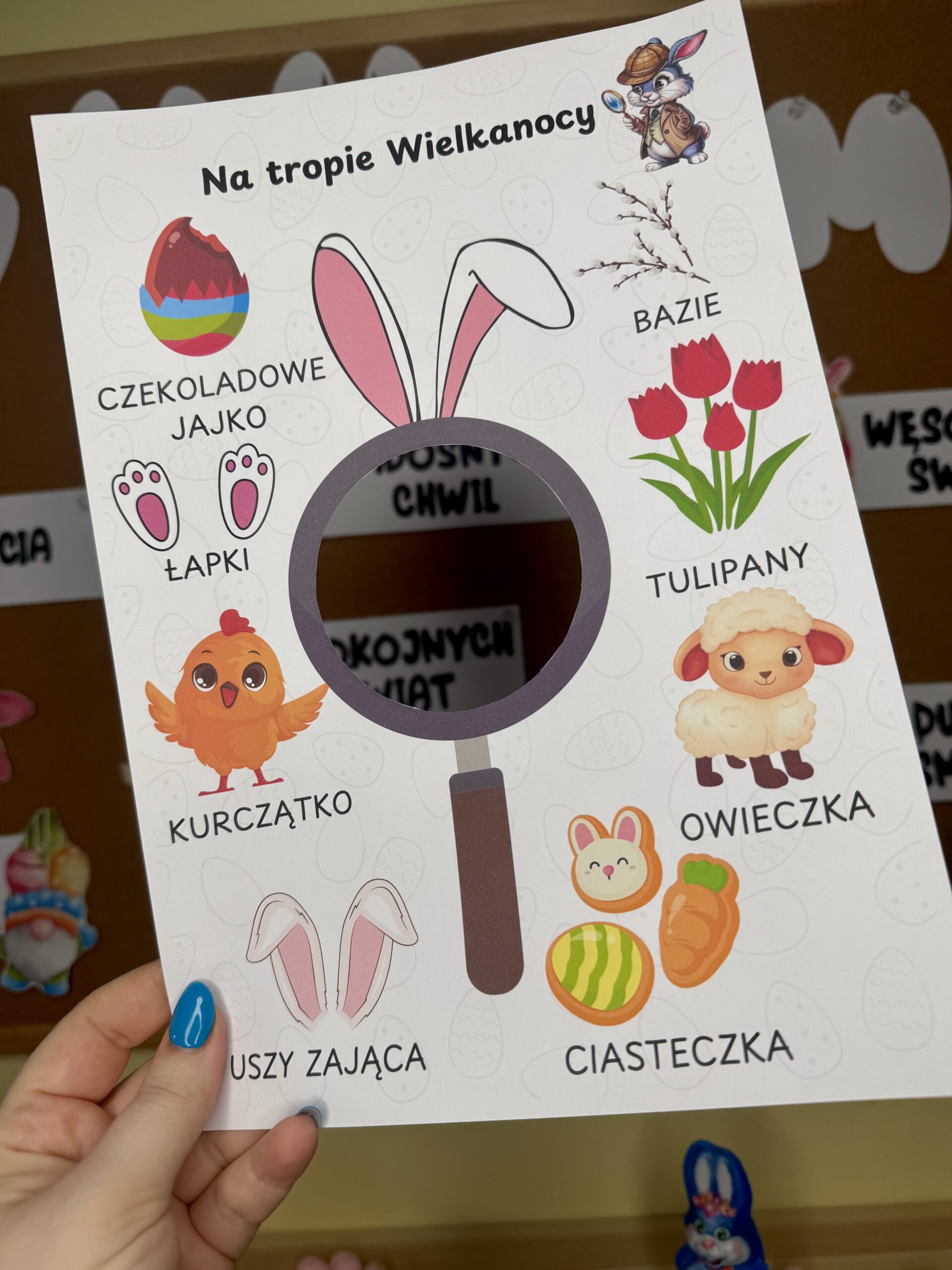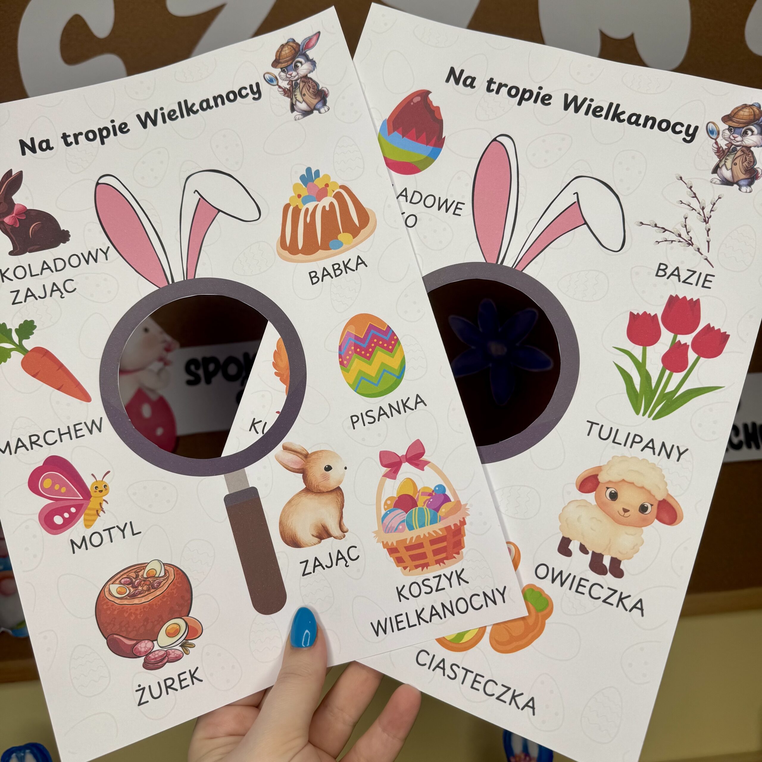 3️⃣ Daj dzieciom lupki i listy poszukiwacza – ich zadaniem jest odnalezienie obrazków.