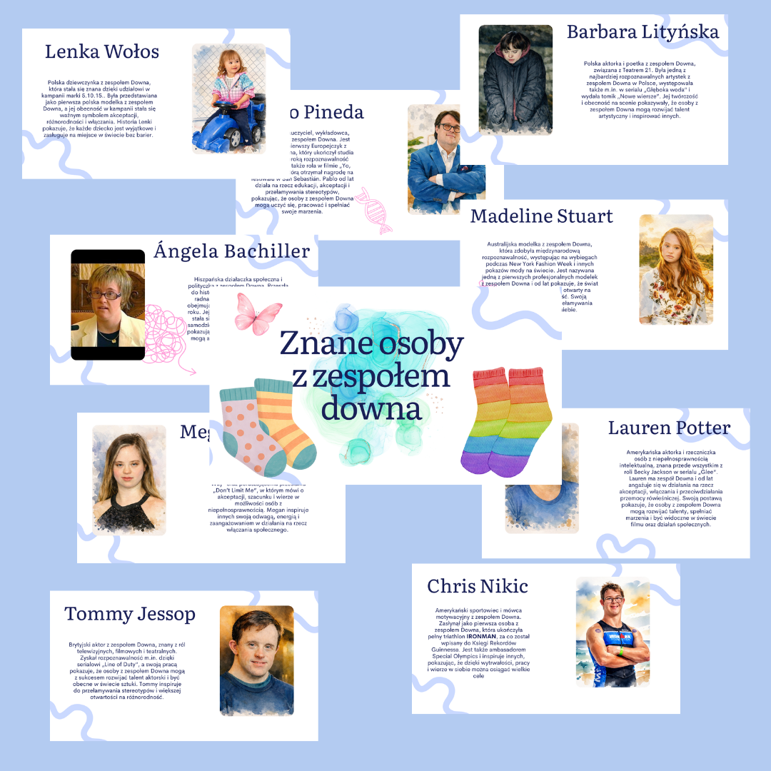 Materiał zawiera plansze prezentujące znane osoby z zespołem Downa oraz krótkie, przystępne opisy ich życia, działań i osiągnięć. W gazetce pojawiają się osoby związane z różnymi obszarami życia społecznego i zawodowego. Znajdziesz tu m.in. sportowca i mówcę motywacyjnego Chrisa Nikica, aktorkę Lauren Potter, nauczyciela i aktora Pablo Pinedę, działaczkę Megan Bomgaars, modelkę Madeline Stuart, polityczkę Ángelę Bachiller, aktora Tommy’ego Jessopa, polską aktorkę i poetkę Barbarę Lityńską oraz Lenkę Wołos, przedstawianą jako pierwszą polską modelkę z zespołem Downa.